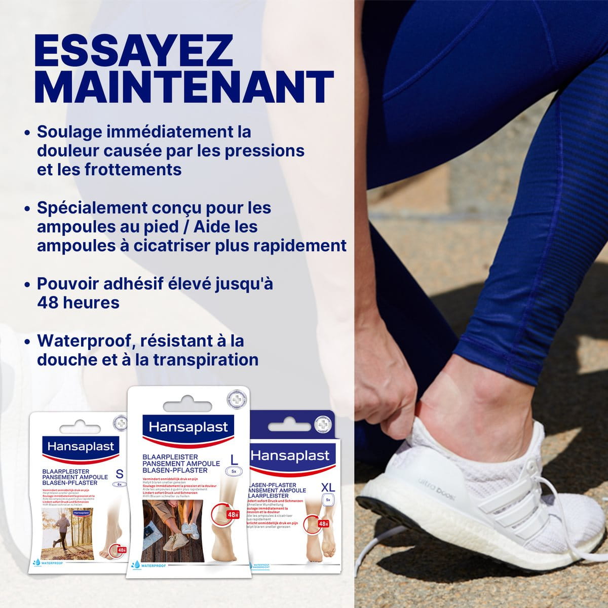 La technologie Adhésion d’Hansaplast garantit aux pansements ampoules de rester parfaitement en place pendant plus de 48 heures. Ils sont imperméables à la transpiration et à l’eau - la douche n’est donc pas un problème. Vous pouvez être sûr que les ampoules sur les orteils disparaîtront plus vite que jamais, même les plus difficiles à atteindre entre les orteils.